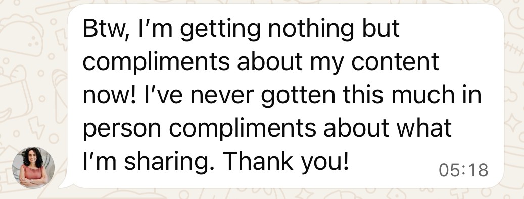 “I’m very excited that I have more clarity around my content schedule. Not being clear on this made me procrastinate a lot. I have so many things to say but I’ve always struggled to know who I should be speaking to and what to say. Having this focus is super helpful!”