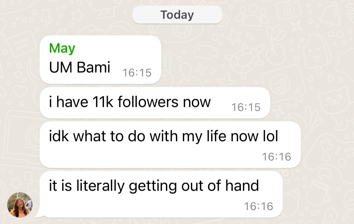 “Bami, I have 11k followers now. It’s literally getting out of hand!”